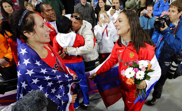 8. Елена Исинбаева на Олимпиаде-2012 проиграла принципиальной сопернице – американке Дженнифер Сур. Это не отменило протокольных поздравлений.