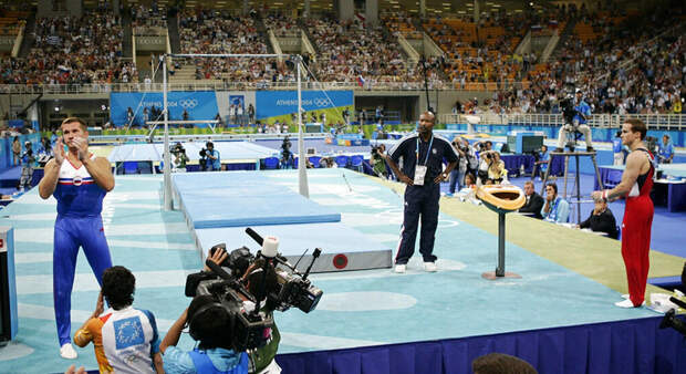 12. Алексей Немов успокаивает зал на Играх-2004 в Афинах – пока зрители свистят из-за странных оценок, свое выступление на перекладине ждет американец Пол Хэмм, победитель в абсолютном первенстве. На кадр не попал момент рукопожатия двух легенд – оно случилось чуть позже.