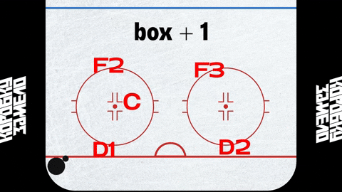 Если там уже два на два, то туда же спускается защитник и делает три на два. Короче, вы пытаетесь создать преимущество до тех пор, пока не выведете шайбу. И, соответственно, у вас спускаются крайние.