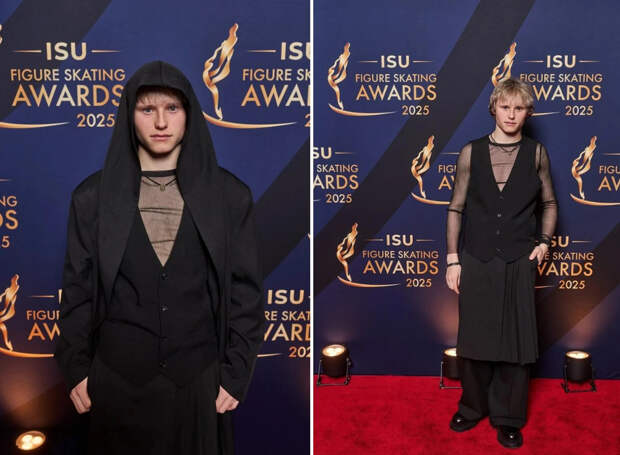 И, конечно, самый яркий лук Малинина – с красной дорожки на ISU Skating Awards прошлого сезона. Капюшон, юбка, сетчатый лонгслив – кажется, в нем было все.