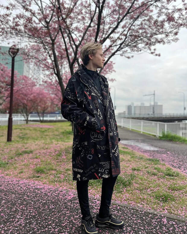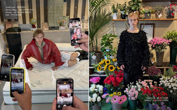 Еще вам наверняка попадались эпатажные луки Ильи – в красной куртке на кровати и в свитшоте в бантиках. Это фотосессия для журнала Focus Style Magazin.