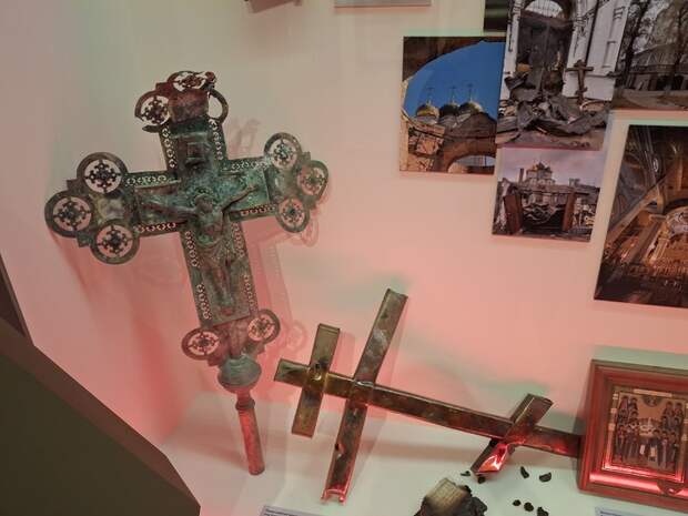 Отмотаем выставку на два зала назад и увидим драматические страницы новейшей истории Донбасса: опаленные и пробитые осколками православные кресты из разрушенных обстрелами храмов. А также спасенное иноками в 2024-м году из огня Евангелие (экспонат передан из Свято-Успенского Николо-Васильевского монастыря в Никольском, известного благодаря схиархимандриту Зосиме, главному «будителю» народа Донбасса).
