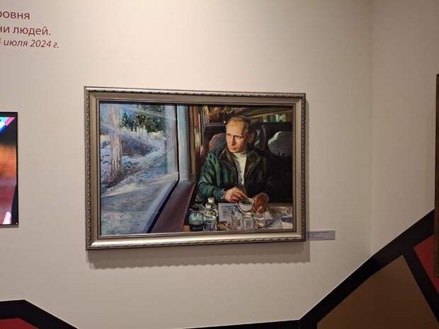 Зато там есть обширный пласт современной живописи о героях СВО: бойцы в форме армии России, обозначение «Z» на БТР и военных грузовиках (речь о картинах Василия Кураксы, Егора Смирнова и других авторов), стилизованные под советские плакаты в духе «Родина надежно защищена!» и «Подвигу наших отцов верны». Причем в том же зале выставили картину с Путиным, который едет в поезде и пьет чай (правда, почему-то из чашки, а не из культового стакана в подстаканнике).