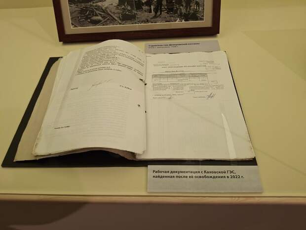 В отличие от Днепрогэса, находящегося на российской, но неподконтрольной территории, Каховская гидроэлектростанция перешла под контроль нашей армии, о чем свидетельствует размещенная в одной из витрин «трофейная» пачка документов на украинском языке: приказы об отпусках персонала и прочее…