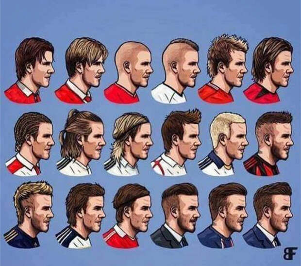 А вот вообще все прически Бекхэма: аж 18 разных! Нефутбольный таймлайн звездного экс-футболиста – легендарная картинка уже долго гуляет по интернету, но все так же актуальна.