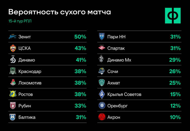 ● «Ростов» – в топ-5 претендентов на сухой матч, хотя сыграет в гостях. Сомнительный прогноз: «Сочи» недавно положил четыре «Ахмату» в Грозном, забил и в Оренбурге, атака у команды качественная. «Ростов» сыграет без дисквалифицированного Роналдо. «Сочи» очень мотивирован по таблице: есть возможность покинуть зону вылета до зимнего перерыва.